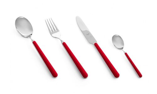 Wilt u wel eens iets anders op tafel? Voor een feestelijke gelegenheid, voor buiten, op vakantie, bij een picknick? Dan is Mepra Fantasia het antwoord! Een bestek dat u zelf kunt samenstellen. Alles in 1 kleur? Meerdere kleuren door elkaar? Mes, lepel en vork samen in de kleur van het logo van uw bedrijf of club? Alles is mogelijk in deze besteklijn. De kleur van dit bestek is rood.