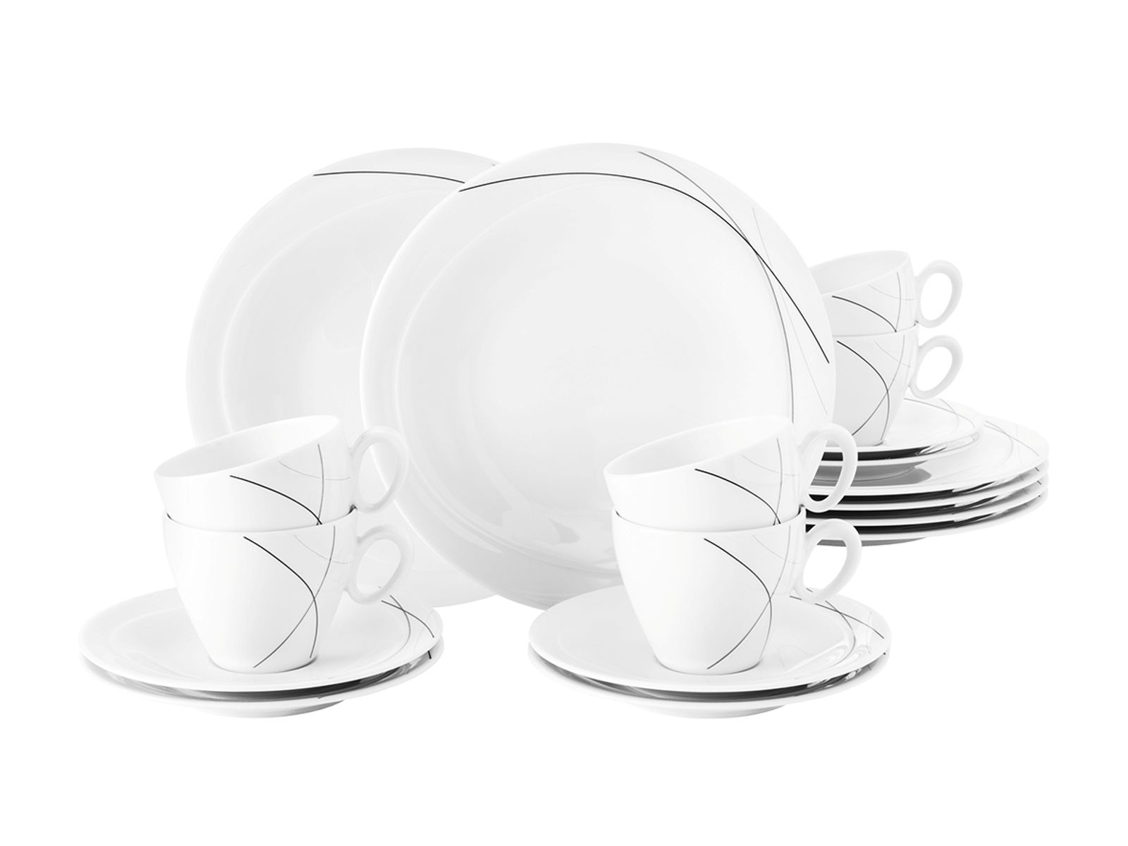 Koffieservies bestaat uit 6 dessertborden (23cm) en 6 koffietassen (0,23l) en ondertassen (16cm)