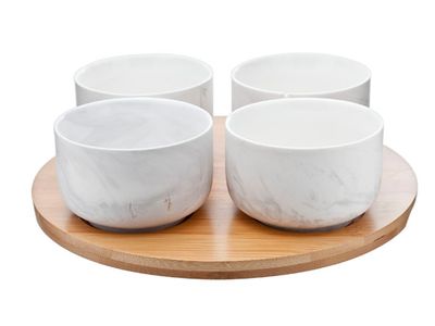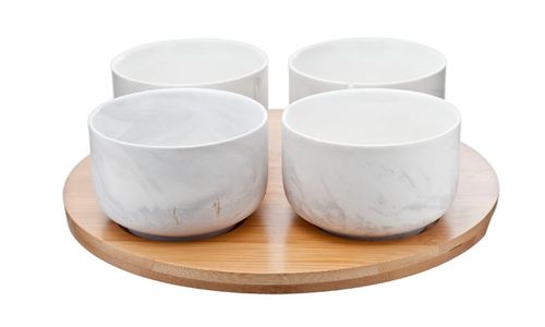 Marble Grey Set5 4x Bowl-1x Bamboeplank Bowl D9xh6cm - Bambooplank D24.5cm