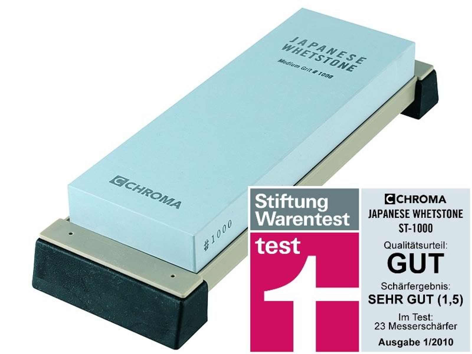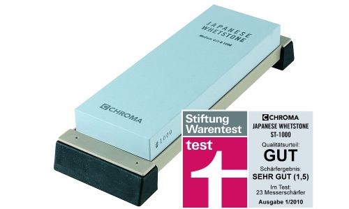 Wetsteen met grit 1000. Het door de fabriek aangescherpte mes heeft een uitzonderlijke levensduur maar dat belet niet dat het noodzakelijk is van tijd tot tijd het mes te slijpen. De beste manier om het lemmet te slijpen is gebruik te maken van een wetsteen. De Japanse wetstenen zijn hiervoor uiterst geschikt. Houd het mes altijd onder een hoek van 15 - 20° wanneer je het aanscherpt. Neem het handvat van het mes goed vast in één hand en laat het lemmet over de wetsteen glijden in een beweging weg en terugkerend naar je lichaam. Tijdens deze repetitieve bewegingen druk je met de vingers van de andere hand op het lemmet zodat het steeds een goed contact met de wetsteen onderhoudt. Nadat de ene zijde aangescherpt is keer je het lemmet om en laat je de andere zijde van het lemmet op dezelfde manier over de wetsteen glijden. Herhaal deze op - en neergaande beweging tot wanneer het mes opnieuw scherp is. Na een aantal keren ben je zodanig getraind dat je het geluid zal herkennen wanneer je het mes goed aanscherpt.