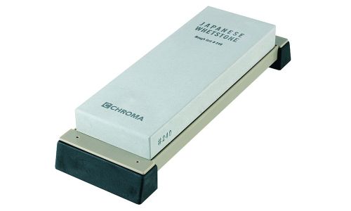 Wetsteen met grit 240. Het door de fabriek aangescherpte mes heeft een uitzonderlijke levensduur maar dat belet niet dat het noodzakelijk is van tijd tot tijd het mes te slijpen. De beste manier om het lemmet te slijpen is gebruik te maken van een wetsteen. De Japanse wetstenen zijn hiervoor uiterst geschikt. Houd het mes altijd onder een hoek van 15 - 20° wanneer je het aanscherpt. Neem het handvat van het mes goed vast in één hand en laat het lemmet over de wetsteen glijden in een beweging weg en terugkerend naar je lichaam. Tijdens deze repetitieve bewegingen druk je met de vingers van de andere hand op het lemmet zodat het steeds een goed contact met de wetsteen onderhoudt. Nadat de ene zijde aangescherpt is keer je het lemmet om en laat je de andere zijde van het lemmet op dezelfde manier over de wetsteen glijden. Herhaal deze op - en neergaande beweging tot wanneer het mes opnieuw scherp is. Na een aantal keren ben je zodanig getraind dat je het geluid zal herkennen wanneer je het mes goed aanscherpt.