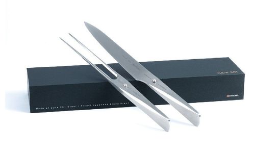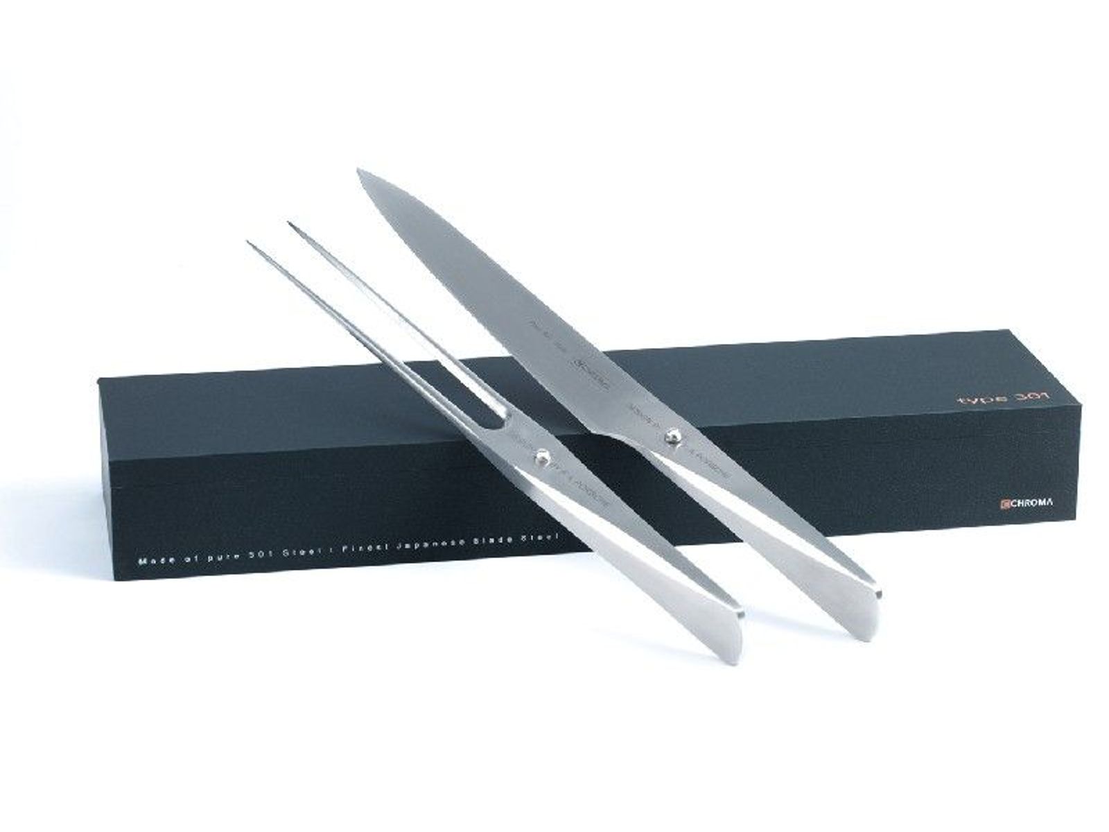 Set bestaande uit een trancheermes met een grootte van 193 mm en een vleesvork met een grootte van 190 mm. Ideaal voor het in plakken snijden van grote stukken vlees. In de unieke messencollectie van Chroma TYPE301 Design by F.A. Porsche is de greep gemaakt van 18/10 roestvrij staal en het lemmet van hoogwaardig Japans staal type 301. Dat maakt het mes bijzonder geschikt als keukengereedschap. Alle messen worden met de hand geslepen door een meesterslijper. De snede van het mes heeft de traditionele Japanse V-vorm, wat het mes uiterst scherp maakt en waardoor het ook lang scherp blijft. Een groeiende schare topkoks hebben hun liefde verklaard aan de creatie van F.A. Porsche. Onderhoud / Deze messen mogen, net als andere koksmessen, niet in de vaatwasser. Ze zijn heel hygiënisch en gemakkelijk te onderhouden omdat ze naadloos zijn. Wassen in warm water en nadien afdrogen volstaat.