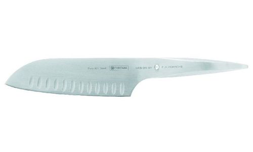 Santoku mes van 17,8cm. In de unieke messencollectie van Chroma TYPE301 Design by F.A. Porsche is de greep gemaakt van 18/10 roestvrij staal in ergonomische vorm voor de beste greep en minste vermoeidheid aan de handen. Het lemmet is vervaardigd uit hoogwaardig Japans staal type 301 (0,7% carbonstaal). Dat maakt het mes bijzonder geschikt als professioneel keukengereedschap. Alle messen worden met de hand geslepen door een meesterslijper. De snede van het mes heeft de traditionele Japanse V-vorm, wat het mes uiterst scherp maakt en waardoor het ook lang scherp blijft. Een groeiende schare topkoks hebben hun liefde verklaard aan de creatie van F.A. Porsche. Ieder mes wordt geleverd in een houten kistje.