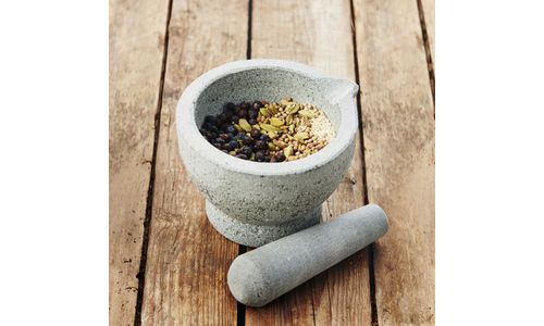 Bereid vanaf nu zelf heerlijke pesto en kruidenmengsels met deze medium vijzel incl. stamper uit graniet van Point-Virgule. Een ideale keukentool om kleine hoeveelheden peperbolletjes, kappertjes of knoflook te pletten, vermalen en mengen. Deze vijzel uit massief graniet is zowel vanbinnen als vanbuiten ongepolijst. Ideaal om ietwat hardere specerijen zoals komijn, anijs,.. fijn te malen. Afmetingen: 14.5 x 10cm |