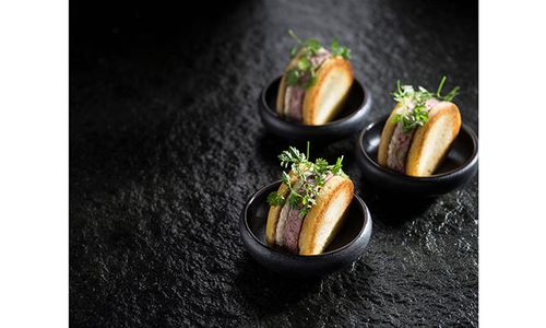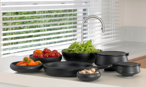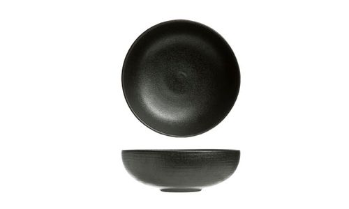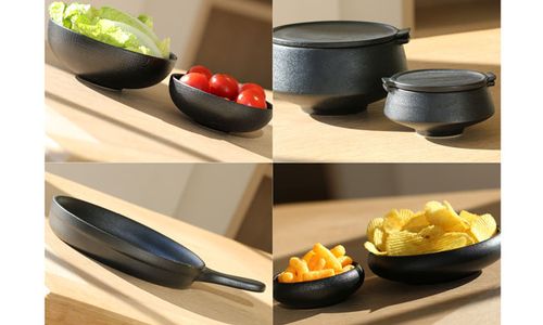 Een zwarte, ronde bink met de look van gietijzer als deze kan veelzijdig ingezet worden. De glorie van kleurrijke bereidingen zal des te groter zijn in dit donkere servies uit aardewerk, omdat de kleurencombinatie van de ingrediënten en de serveeroplossing zo pittig is.