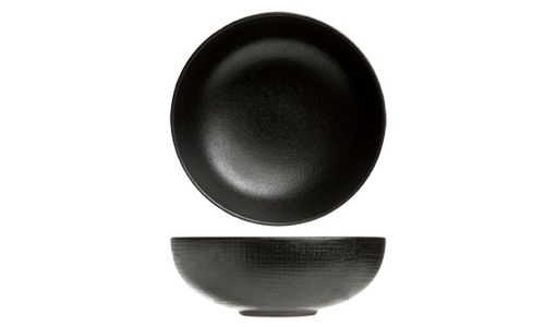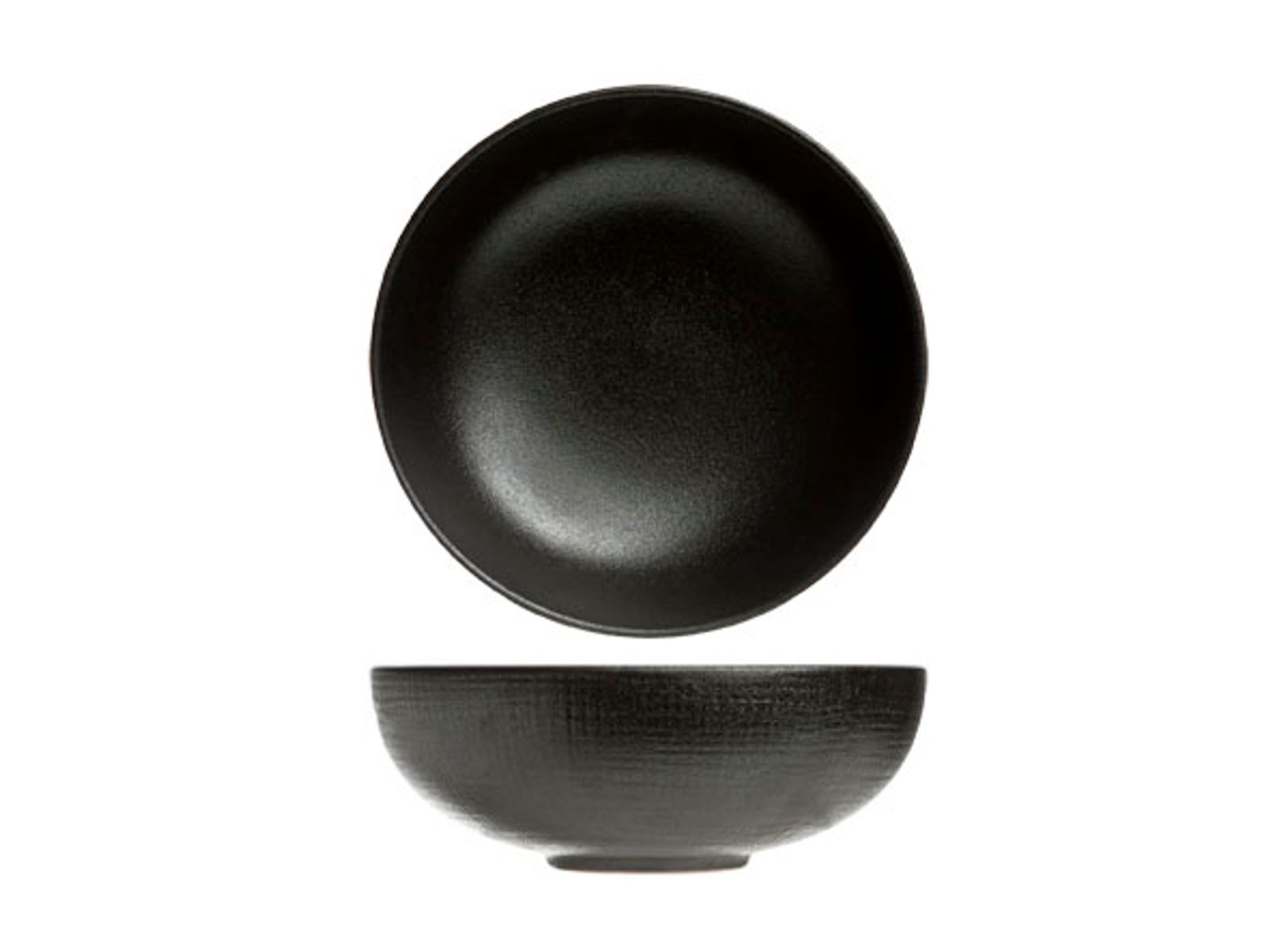 Een zwarte, ronde bink met de look van gietijzer als deze kan veelzijdig ingezet worden. De glorie van kleurrijke bereidingen zal des te groter zijn in dit donkere servies uit aardewerk, omdat de kleurencombinatie van de ingrediënten en de serveeroplossing zo pittig is.