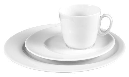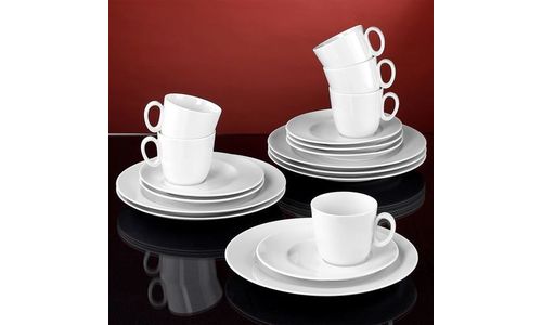 Koffieservies bestaat uit 6 dessertborden (23cm) en 6 koffietassen (0,22l) en ondertassen (17cm)