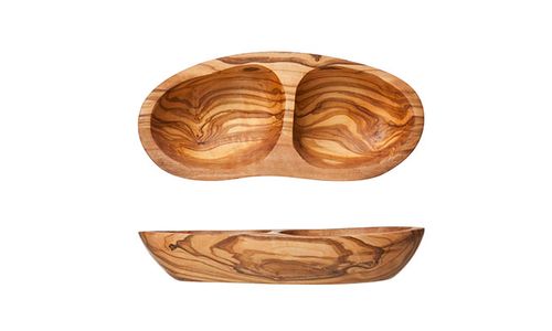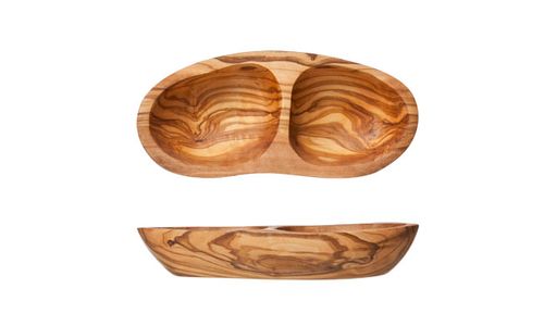Opgelet: de vorm en het aantal vakken kan afwijken van de afbeelding. Deze schaaltjes zijn gemaakt uit massief olijfhout. Door de grillige vorm van de bomen zijn ze uniek van vorm, afhankelijk van de stam waaruit ze gesneden zijn. Olijfhout is erg mooi en bovendien zeer hard en dicht van structuur, dus perfect om voeding op te presenteren en makkelijk te onderhouden. ANTIPASTI BORD MET 2 COMPARTIMENTEN