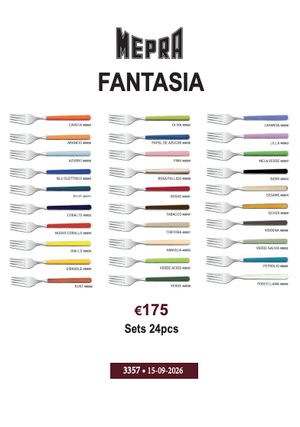 Kenmerken van dit bestek zijn originaliteit en Italiaans topdesign. Fantasia bestek is uitgevoerd in RVS 18/10 met handvatten in absoluut kleurvaste, onverslijtbare en vaatwasmachinebestendig ABS-kunststof.