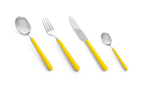 Wilt u wel eens iets anders op tafel? Voor een feestelijke gelegenheid, voor buiten, op vakantie, bij een picknick? Dan is Mepra Fantasia het antwoord! Een bestek dat u zelf kunt samenstellen. Alles in 1 kleur? Meerdere kleuren door elkaar? Mes, lepel en vork samen in de kleur van het logo van uw bedrijf of club? Alles is mogelijk in deze besteklijn. De kleur van dit bestek is geel.
