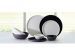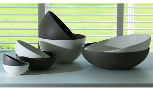 De naam 1350 verwijst naar de baktemperatuur van de collectie. Eerder exceptioneel, want regulier aardewerk wordt op 850° gebakken. Het servies is quasi even sterk als porselein, maar heeft de typische look & feel van aardewerk. De onderdelen hebben een zwarte of witte kleur, zodat de tafel een uitgesproken of eerder voorzichtig karakter krijgt. Of ze nu afzonderlijk gebruikt of gecombineerd worden, het resultaat is immer tijdloos.