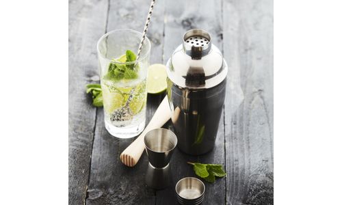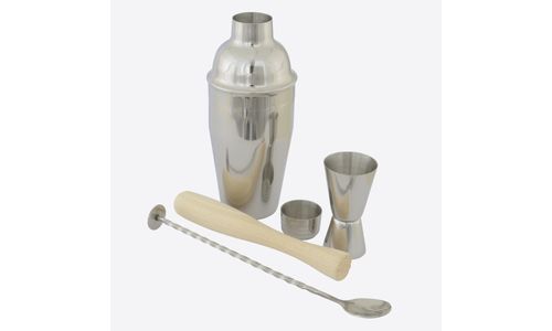 4-del. cocktailset - barlepel, maatje, stamper & cobbler shaker