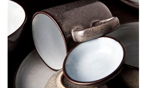 Ciel Bleu is een aantrekkelijke nieuwe serviescollectie met een helder blauwe binnenkant die contrasteert met een donkere, gespikkelde buitenkant en een opvallende zwarte rand. Het contrast tussen de binnen- en buitenkant wordt des te groter door de afwerking: mat aan de buitenkant met een blinkende binnenkant.