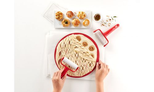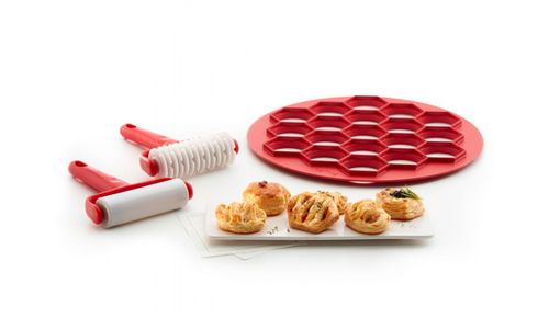 Bereid in een zeer korte tijd een grote selectie huisgemaakte hartige of zoete petits-fours, als komen ze van de traiteur. Je gasten zullen versteld staan! De set bevat een dubbelzijdige snijder die is ontworpen om 19 kleine zoute of zoete (ronde of hexagonale) ovenhapjes in één keer te bereiden, een soepele rol voor het snijden van deeg op de bovenkant en een andere ribbel voor het decoreren van het deeg van het traditionele visnetpatroon. Haal inspiratie uit het receptenboek, kies het deeg en de vulling waar je de voorkeur aan geeft en laat je fantasie de vrije loop!