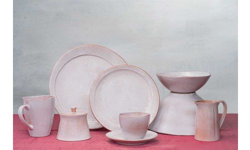 Eleonora is een aardwerken serviescollectie met een uniek uitzicht. Eerst en vooral valt de kleur op: zacht lichtroze met donkerdere spikkels en randen. Daarnaast zijn ook de vorm en de afwerking opmerkelijk. De borden zijn niet perfect rond en hebben een ondiep reliëf in het oppervlak en asymmetrische boorden. De reeks Eleonora is perfect te combineren met haar zusje Theodora, met haar lichtblauwe kleur.