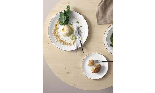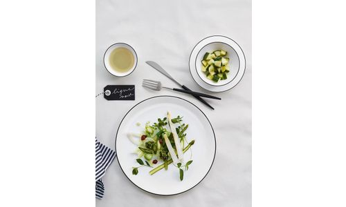 Een met een penseel aangebrachte handgeschilderde zwarte lijn siert de omvangrijke serviesserie “à table ligne noire” en vormt een extravagante afwerking van dit servies. De serie is ontworpen voor elke gelegenheid: hij overtuigt door zijn extreme hardheid, warm wit, helder design, pure elegantie en enorme verscheidenheid aan vormen voor een perfect gedekte tafel. De extreme randsterkte en stapelbaarheid maken de schalen ook geschikt voor gebruik in de horeca. Te combineren met “à table”, zonder zwarte randversiering.