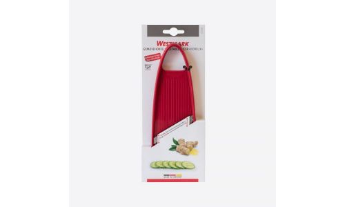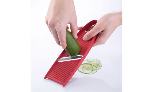 met een tweesnijdend, zeer scherp mes - ideaal voor dunne komkommer-, courgette-, aubergine- of uienplakken