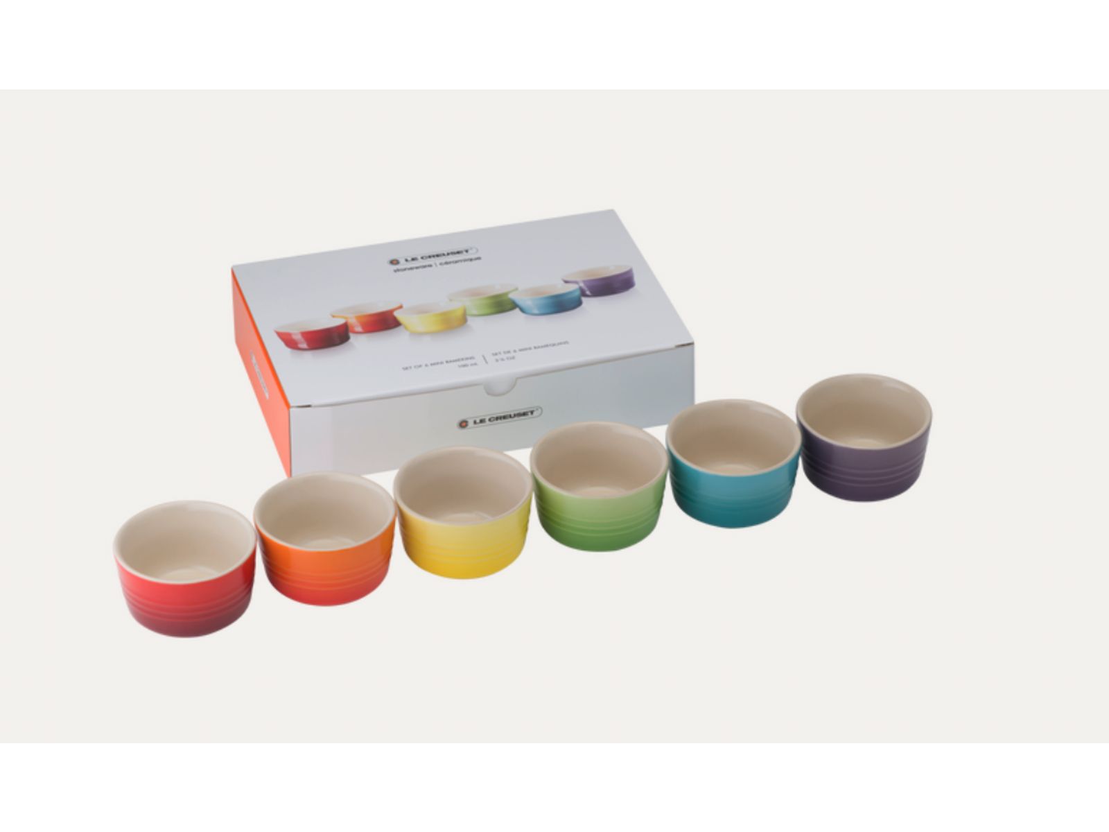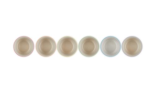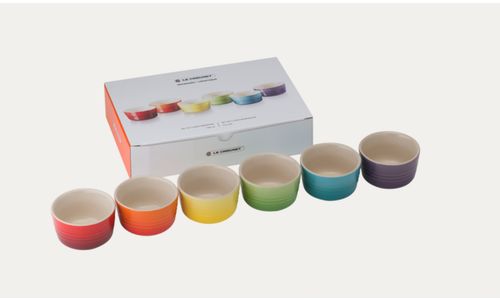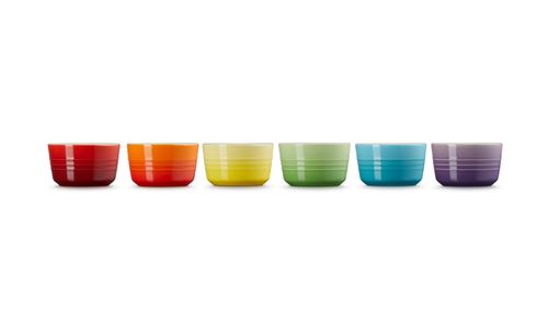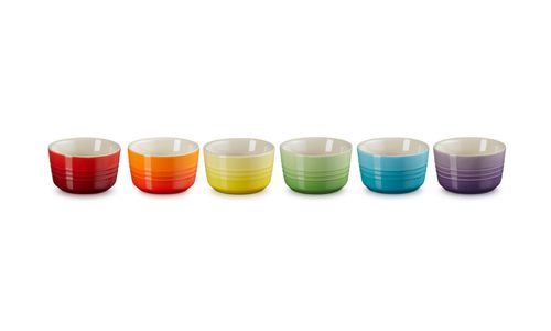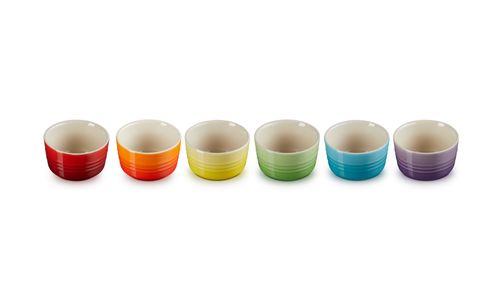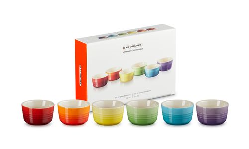 Een prachtige set met zes kleine ramekins van aardewerk, in een combinatie van felle regenboogkleuren. Deze handige potjes kunnen op allerlei manieren worden gebruikt, van het bereiden van warme gerechten in de oven of onder de grill tot het serveren van dips, garnituren, hapjes, tapas en zelfs kleine desserts. Ze zijn verpakt in een stijlvolle geschenkdoos, waardoor ze perfect zijn om cadeau te doen.