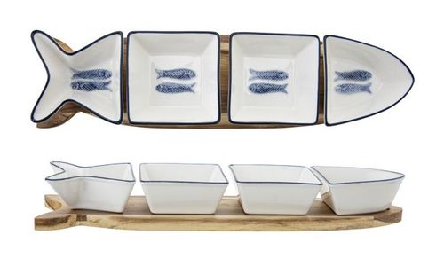 Branzino Aperoset 5dlg 37x9,5xh4,8cm Vorm Vis - 4 Potjes + Houten Basis