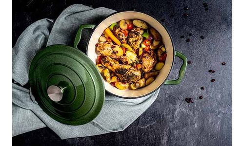 Castard is a real asset for your kitchen. The unique craquelure enamel on the inside not only looks the business, it is also very functional. Both the heat conducting cast iron on the inside and the interior enamel coating allow you to simmer your favourite dishes on a low heat. The cast iron pan is suited for all heat sources and goes up to 240°C in the oven.