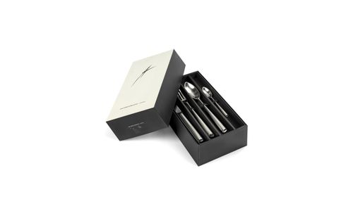 Met dit bestek legt Ann Demeulemeester een vernieuwende vorm op tafel. Puur en een beetje gevaarlijk zelfs. Door haar aanpak in drie dimensies krijgen de messen, vorken en lepels een sterk sculpturale vorm. Een vorm die onderling verschilt in de manier waarop het heft met de hand gefacetteerd werd. De manier waarop het licht door de facetten wordt gebro-ken creëert een elegantie die in contrast staat met de zwaarte van het bestek. Zoë bestaat in vier uitvoeringen: in mat zwart roestvrijstaal, in mat antraciet roestvrijstaal, in gepolijst roestvrijstaal en in gepolijst roestvrijstaal dat werd verzilverd.