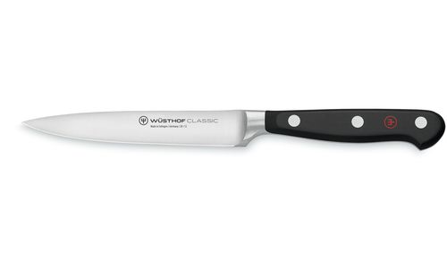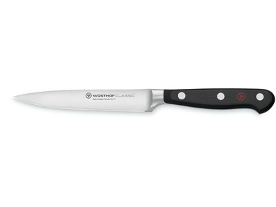 Klein, veelzijdig mesje met slank lemmet en gladde rand: dit groentemes is gemaakt voor het snijden van uien en kruiden en is ook handig voor het hakken, schoonmaken en decoreren van fruit en groenten. Met het scherpe, puntige lemmet werkt dit groentemes ook goed als lardeermes.