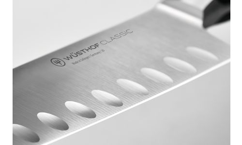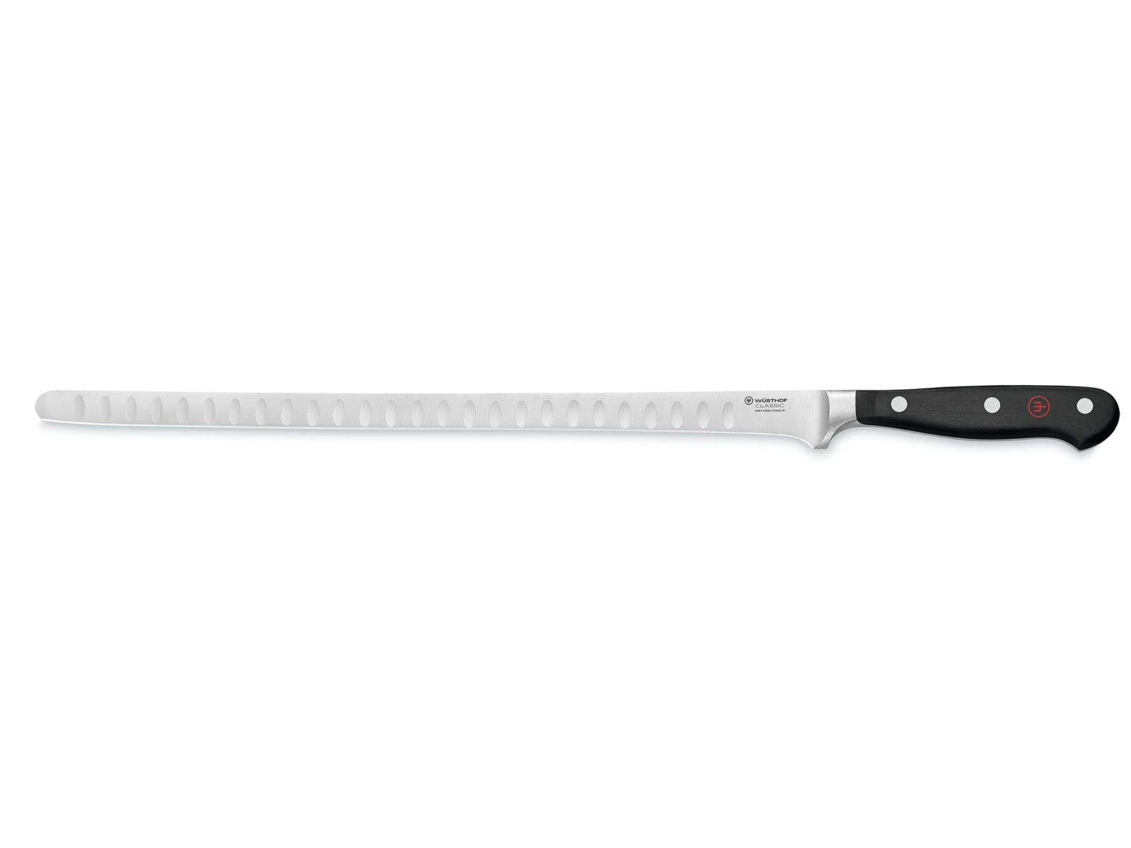 Het ideale gereedschap voor het bereiden en snijden van zalm: dit zalmmes, met flexibel en uiterst scherp lemmet, glijdt gemakkelijk door de vis en is bijzonder geschikt voor zalm omdat je er ook flinterdunne plakjes mee kunt snijden. De golfjes - lichte holtes aan de rand van het lemmet - zorgen voor kleine luchtkussentjes die voorkomen dat de vis aan het mes blijft plakken.