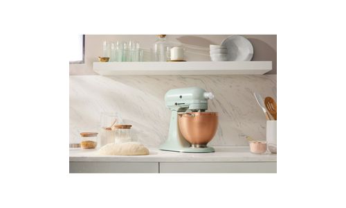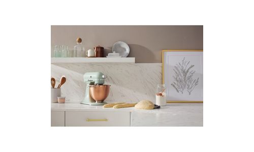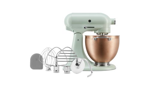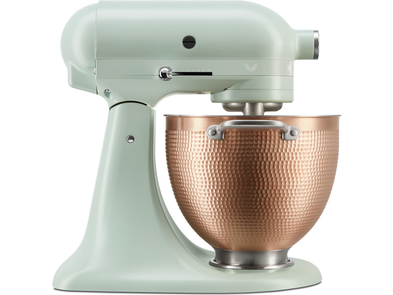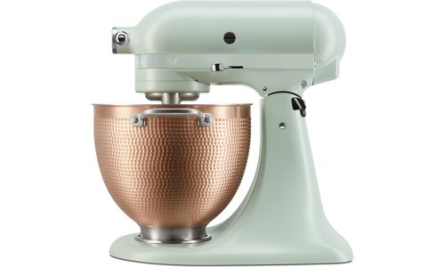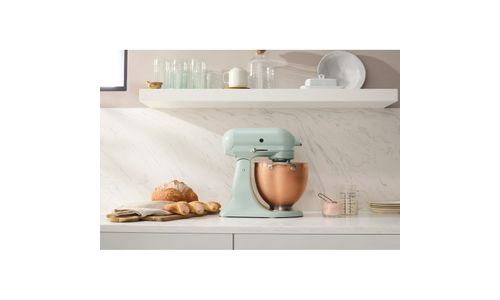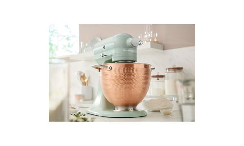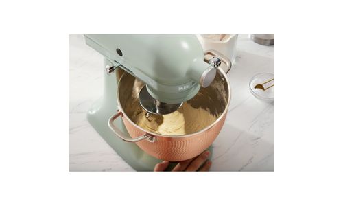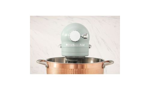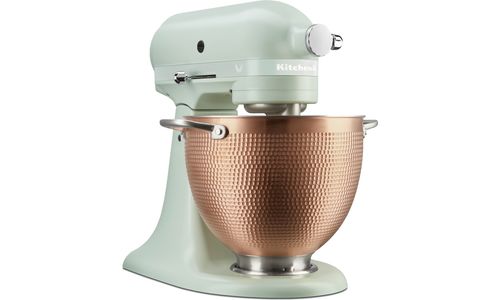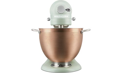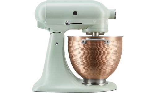 De 4.7 L keukenrobot uit de Design Serie in Blossom - Artisan is een iconische keukenrobot met kantelbare kop van KitchenAid in een unieke zachte tijmgroene kleur met een gehamerd koperen kom. Dankzij het degelijke ontwerp is het haast een verlengstuk van je handen. Je kunt jezelf vol vertrouwen uitdrukken. De motor is stil en gaat lang mee en het originele planetaire kneedsysteem zorgt voor snel en grondig mengen, met wel 59 raakpunten in de kom per omwenteling. Deze keukenrobot wordt geleverd met een koperen kom van 4.7 L met een voedselveilige roestvrijstalen binnenkant. Hij ontwikkelt na verloop van tijd een uniek patina of je kunt hem polijsten, afhankelijk van je voorkeur. De keukenrobot wordt geleverd met een volledig roestvrijstalen garde, kneedhaak, platte menghaak en deeghaak. Naarmate je je ontwikkelt als maker zijn er tal van interessante optionele hulpstukken (afzonderlijk verkrijgbaar) die je kunt bevestigen op de multifunctionele accessoirenaaf. Je hebt keuze genoeg, van een pastasnijder tot een voedselmolen, Japanse groentesnijder of graanmolen. Laat je creativiteit de vrije loop.