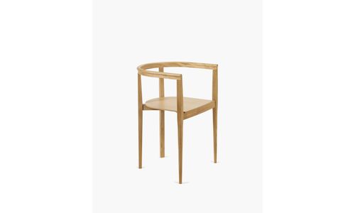 De sierlijke Elé stoel belichaamt de spanningen die in veel van de collectiestukken spelen, met een ontwerp dat experimenteert met zowel vorm als dimensie. Hij raakt de grond lichtjes, wat de sterkte van het houten frame verraadt, terwijl de voorpoten een onverwachte draai hebben, die subtiel overgaat van vierkant naar rond bij de zitting. Het bijna vlakke front en de gebogen rug- en armstructuur creëren van bovenaf gezien een stevige D-vorm, die bijna haaks lijkt te staan op de slanke lijnen van het profiel van de stoel. Het resultaat is een stoel die tegelijkertijd verfijnd, elegant en grafisch is.