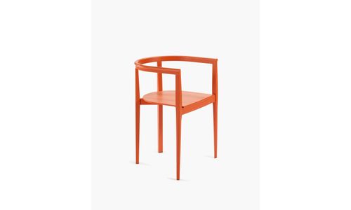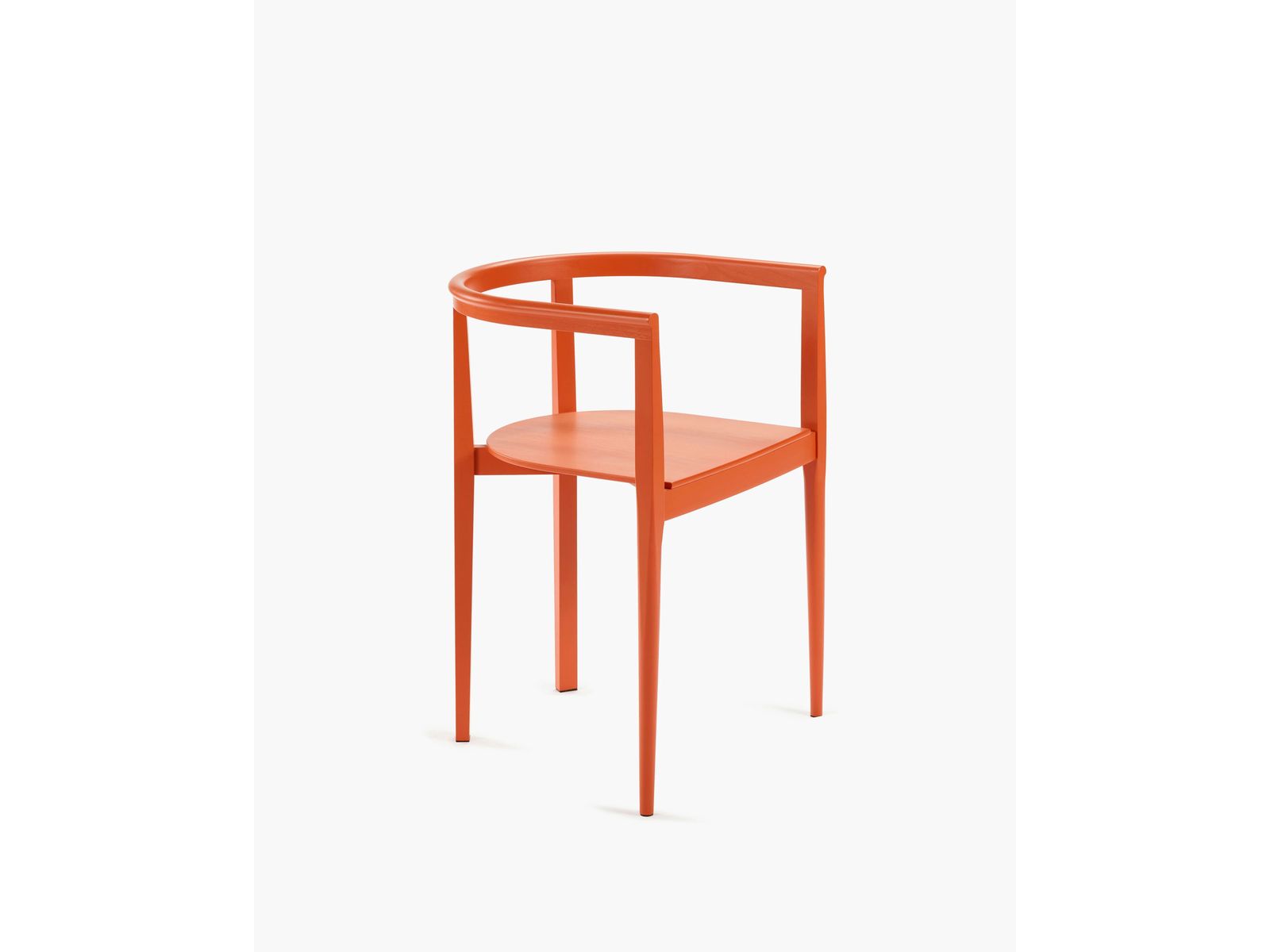 De sierlijke Elé stoel belichaamt de spanningen die in veel van de collectiestukken spelen, met een ontwerp dat experimenteert met zowel vorm als dimensie. Hij raakt de grond lichtjes, wat de sterkte van het houten frame verraadt, terwijl de voorpoten een onverwachte draai hebben, die subtiel overgaat van vierkant naar rond bij de zitting. Het bijna vlakke front en de gebogen rug- en armstructuur creëren van bovenaf gezien een stevige D-vorm, die bijna haaks lijkt te staan op de slanke lijnen van het profiel van de stoel. Het resultaat is een stoel die tegelijkertijd verfijnd, elegant en grafisch is.