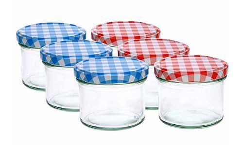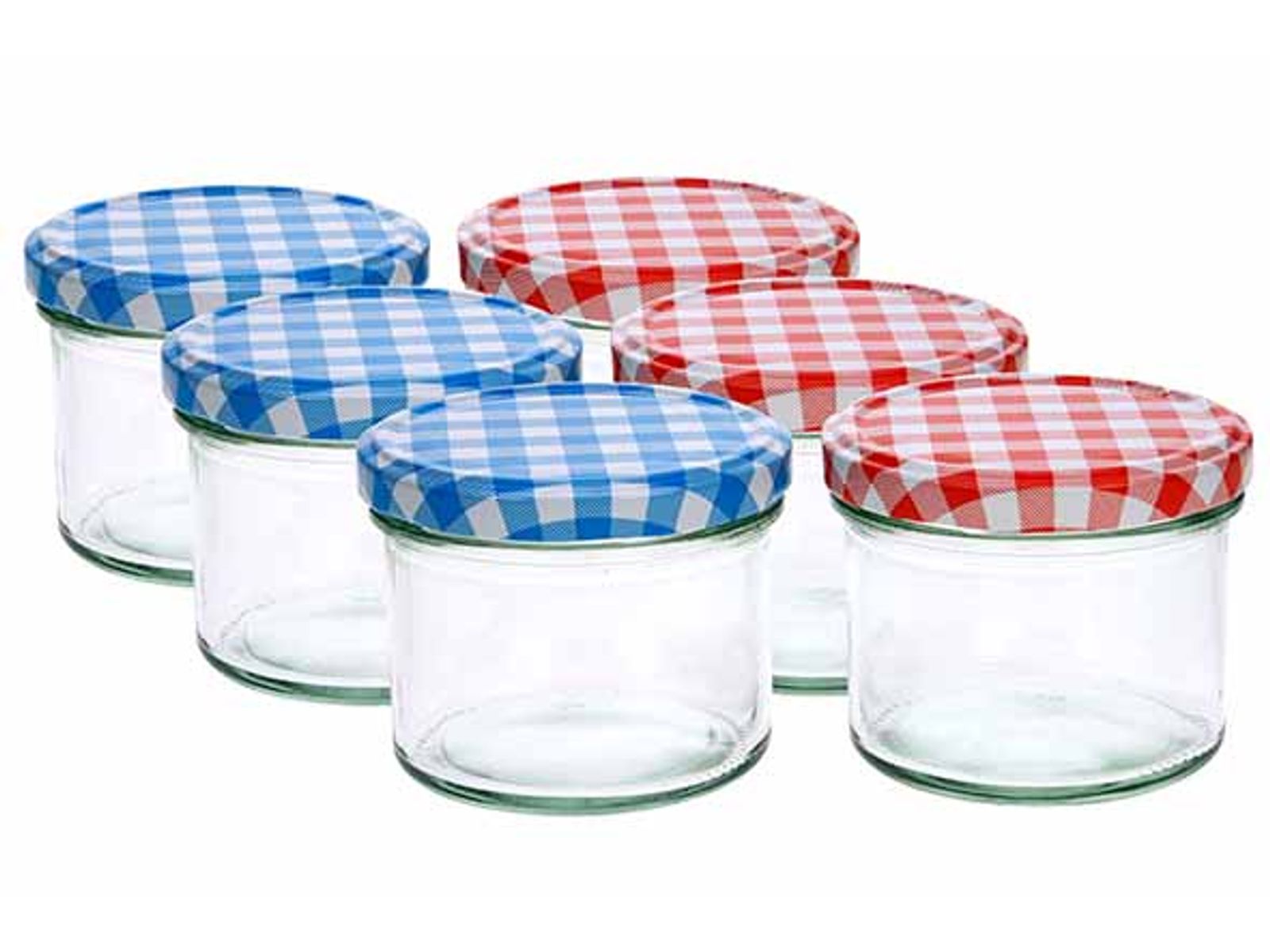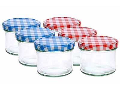 Confituurpot Set6 Transparant 23cl 8,5cm Deksels: 3x Blauw-wit + 3x Rood-wit