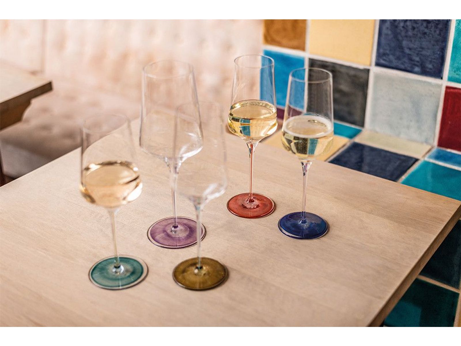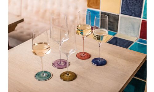 Mondgeblazen van Zwiesel, maakt Ink indruk met een gekleurde draad in de steel en een harmonieus gekleurde basis. Door middel van een complex proces, gebaseerd op traditionele handwerktechnieken, ontstaan ??individuele aquarelachtige kleurverlopen in de voet. De zo ontstane dynamiek wordt ondersteund door het frisse kleurenpalet en het samenspel van de verschillende kleuren handgreep en basis. De innovatieve onderste delen contrasteren met de functionele bovenste delen, die elk drankje de ideale omgeving bieden om van te genieten.
