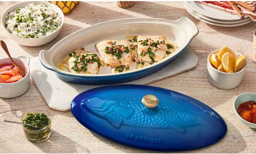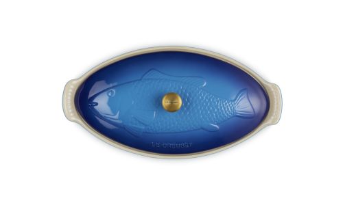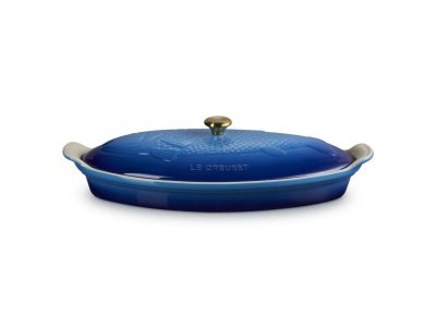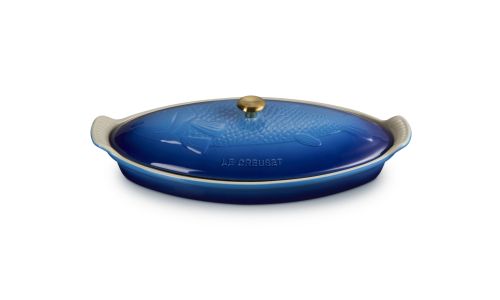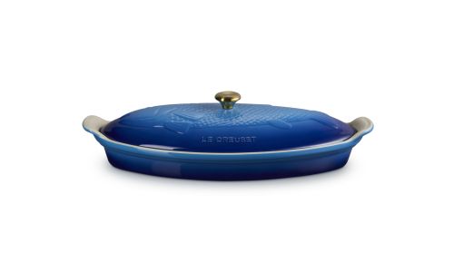 Deze ovenschaal met reliëf is voorzien van een elegant vismotief en een gouden knop voor een opvallende presentatie. Het is ideaal voor het bakken, braden en stomen van vis, maar ook voor het braden en stomen van groenten en vlees, éénpansgerechten en meer. De groeven verhogen het voedsel voor een gelijkmatige garing, terwijl het deksel het vocht vasthoudt.