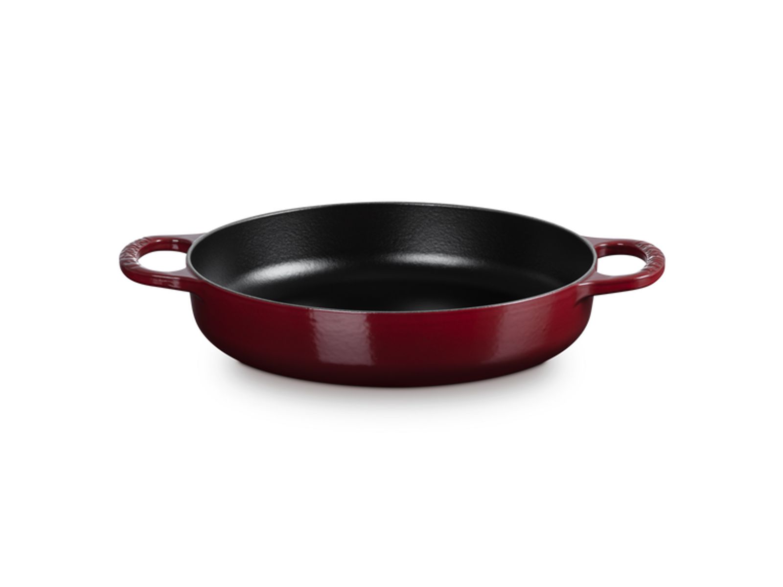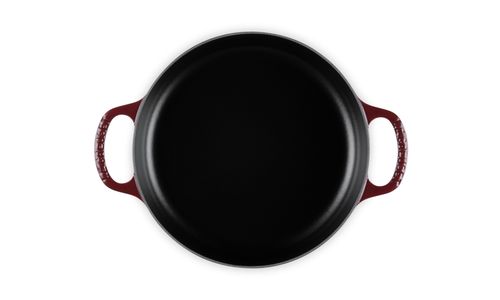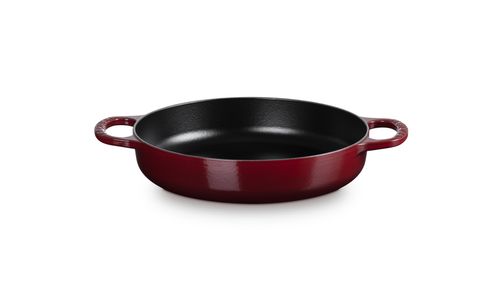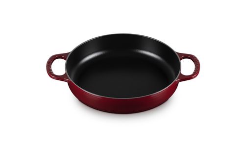 De Signature Hapjespan van geëmailleerd gietijzer heeft een royale diepte en een breed oppervlak, ideaal voor het braden, bakken, sudderen van sauzen en meer. Het combineert de voordelen van een sauteuse met een koekenpan, met licht gebogen zijkanten voor moeiteloos roeren. Grote handgrepen zorgen voor een stevige grip.