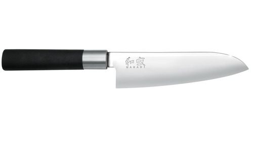 Santoku mes, vrij vertaald de drie voordelen. Het Santoku mes mes is de traditionele Japanse vorm van een universeelmes, vergelijkbaar met het Europeese koksmes. De aanduiding drie voordelen komt voort uit de universele gebruiksmogelijkheden voor het snijden van vis, vlees en groenten